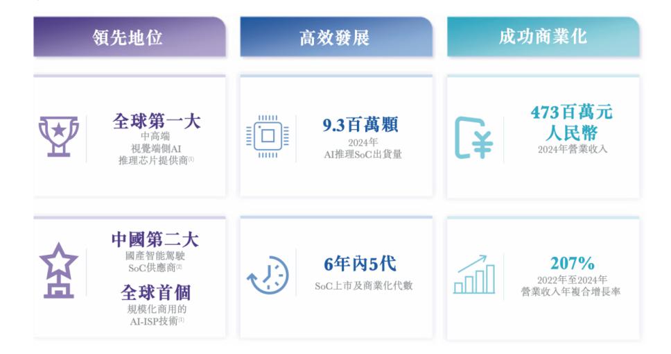 在智能汽车赛道,根据灼识咨询的数据,按 2024 年售出的智能汽车 SoC 安装量计算,爱芯元智是中国第二大国产智能驾驶 SoC 供应商。截至 2025 年 9 月 30 日,爱芯元智已商业化并售出超过 51.8 万颗智能汽车 SoC,至年 2025 年年底其智能汽车芯片累计出货量近 100 万。