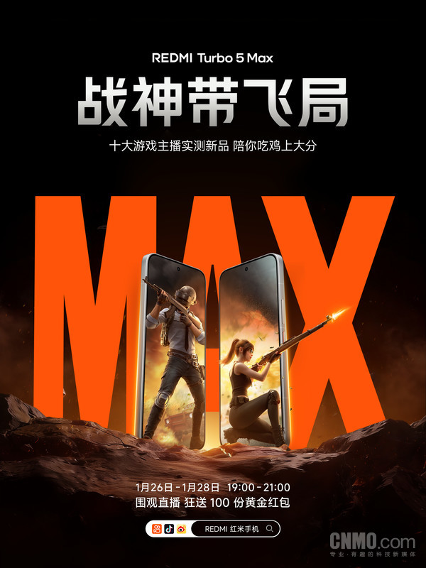 【CNMO科技消息】1月25日牛来乐,REDMI红米手机官方宣布:明日开战!REDMI Turbo 5 Max “战神带飞局”,十大游戏主播连续三天(1月26日-28日)实测新品。